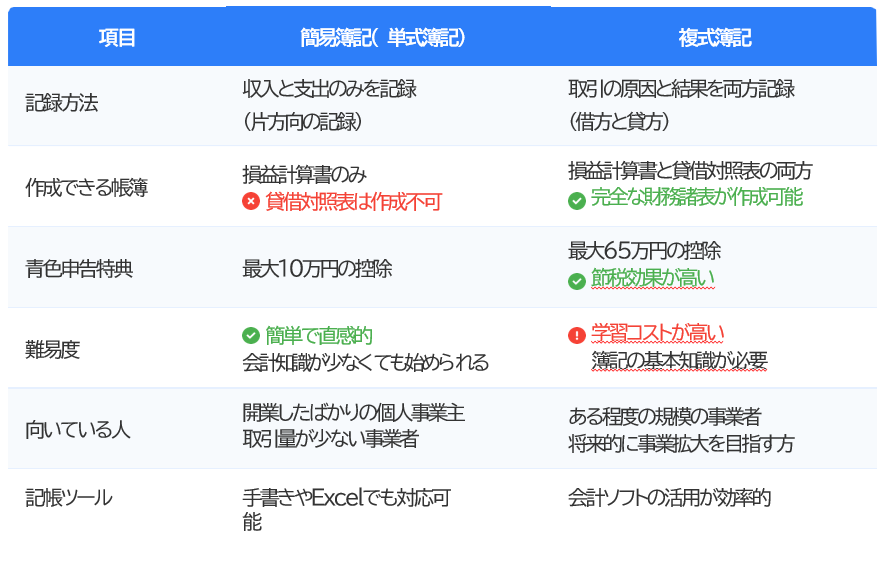 時間や労力がかかるものの、青色申告特別控除という税制上の優遇措置を考えると、やはり複式簿記を選びたいところです。